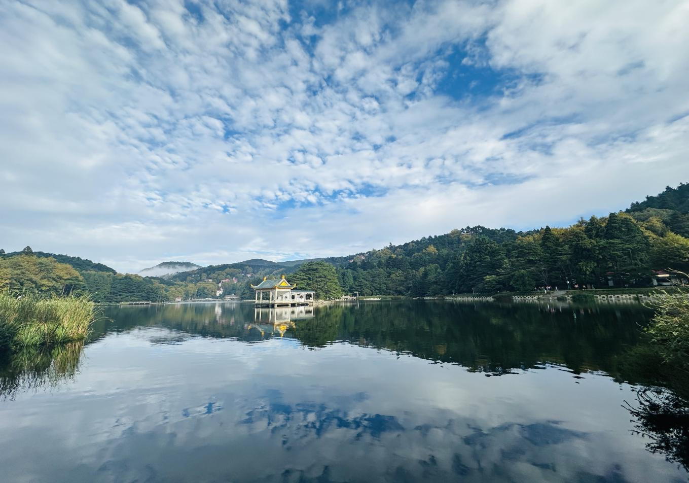 从含鄱口下来,如琴湖的温婉便撞入眼帘。湖水澄澈,将蓝天、白云、绿树、亭台一一揽入怀中,形成对称的绝美画面。我沿着湖岸徐行,微风拂过,湖面泛起涟漪,倒映的景致也随之轻轻晃动,如同一幅动态的山水长卷。