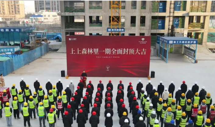 公元二零二六年一月二十三日上午,由我司设计的,万众期盼的渭南上上·森林里一期封顶仪式正式拉开帷幕。陕西上上集团联合项目建设、监理等合作单位,与奋战在一线的建设者们欢聚一堂,共同定格这一值得铭记的荣耀时刻。上上·森 林里项目位于渭南市。地块北侧为曹井街,东侧为六泉路,西侧为渭清东路,南侧为西华街。项目由14栋一类高层住宅、1栋多层幼儿园、1栋单层公共厕所、2栋单层商业及地下车库组成。总建筑面积25万平米,本次封顶的为一期项目,面积约10万平米。