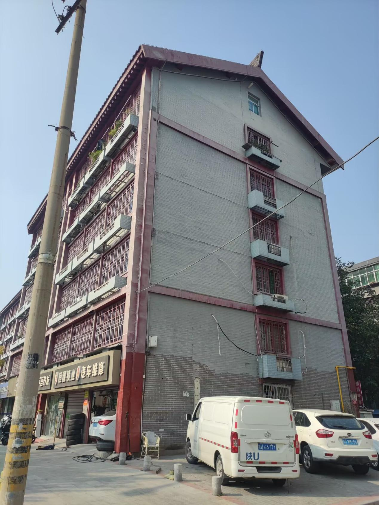 青砖褪色、墙皮斑驳,纵横的裂缝如同岁月镌刻的皱纹,随意悬挂的空调外机与杂乱缠绕的管线,让咸阳电影院家属院1号楼在数十年风雨侵蚀中,逐渐褪去往日规整风貌。这栋建成于20世纪七八十年代的老旧单位家属院楼栋,承载着几代居民的居住记忆与单位情怀,见证了咸阳市老城区的变迁与发展。然而,随着使用年限的增长,楼栋年久失修,不仅陷入居住体验不佳的困境,其破败外观也与周边城市风貌、文旅片区定位严重脱节。