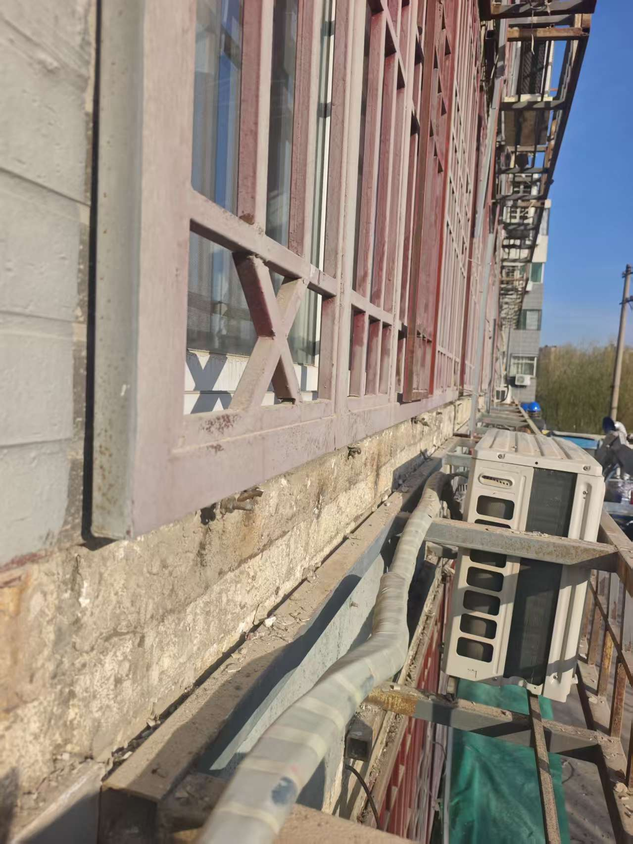 2.窗户格栅固定松动问题:在对窗户格栅进行重新喷漆施工时,发现外墙窗户格栅上口原有膨胀螺丝普遍松动、失去固定作用,部分格栅仅采用铁丝与膨胀螺丝简易连接,导致现状窗户格栅存在不同程度松动,存在安全隐患。设计单位第一时间优化设计,制定针对性加固方案,在松动部位增设固定构件,规范固定工艺,强化窗户格栅的牢固性,消除安全隐患,保障后期使用安全。
