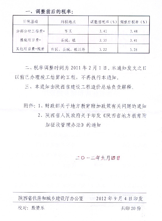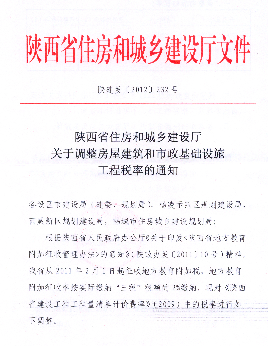 陕建发【2012】232号文/陕西省住房和城乡建设厅关于调整房屋建筑和市政基础设施工程税率的通知
