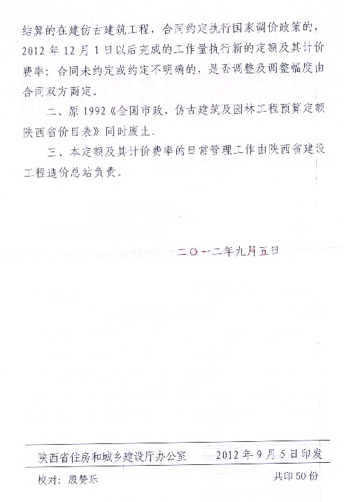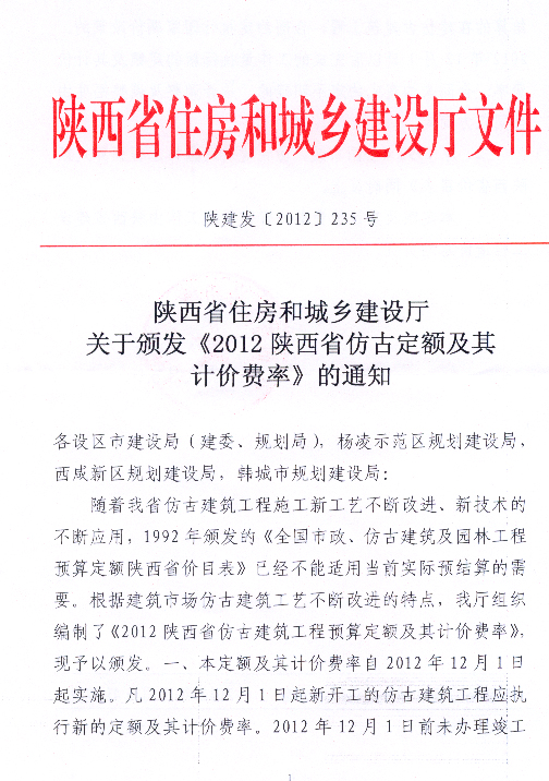 陕建发〔2012〕235号/陕西省住房和城乡建设厅关于颁发《2012陕西省仿古定额及其计价费率》的通知