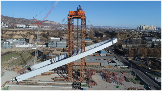 景观大桥为跨径108+128m的独塔双索面钢拱钢梁斜拉桥。塔采用拱形塔,全塔采用钢结构,塔高为 117.5m,桥面以上塔高76.5m,桥面以下41m,钢索塔采用卧式拼装,整体同步提升滑移竖转到位的施工方式,提升重量最大为2200t,提升重量与竖向90度转体为目前同类型转体施工之最。