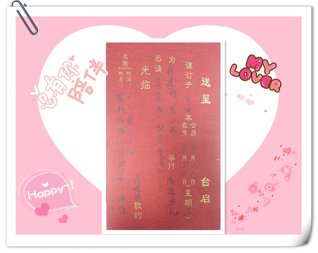 一张小小的结婚喜帖,估计好多当事人不一定现在还保留着,但我一直保存它们,时不时的翻看回味一下,看着喜帖里年轻人的成长历程,又何尝不是我们希格玛公司的发展历程呢,红红的喜帖祝福着一对对新人婚后火热的生活和红红火火的日子,一张张喜帖摞在一起,就是红红的一摞子,红红的一摞子喜帖就是一群充满活力、敢想敢干、勇于创新年轻人的拼劲,他们也是希格玛的未来和希望,借此希格玛集团二十周年年大庆之季,献上我珍藏的红红喜帖,祝愿希格玛造价公司充满生机服务无止境,锦绣未来满意永追求!祝愿希格玛集团鸿运当头年年奏凯歌,红红火火岁岁铸辉煌!