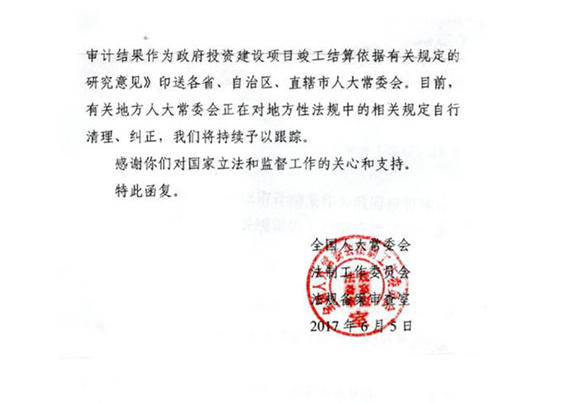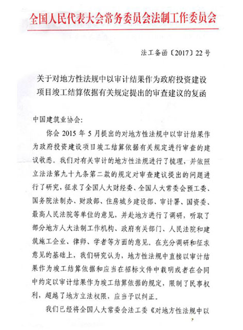 转-全国人大常委会法工委对地方性法规中以审计结果作为政府投资建设项目竣工...